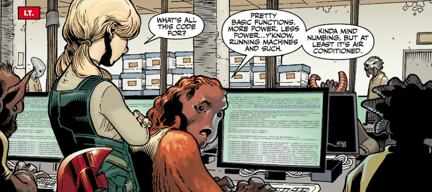 In the IT room, they write code to control machines, but don’t know which machines or why. But it’s air‑conditioned.