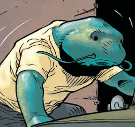 She dusts herself off and races to the beaked creature. She asks if he’s okay, but he anxiously pushes her away. He doesn’t know anything and he doesn’t want trouble.
