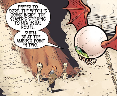 As they talk, neither notices the creature above them — an eyeball with dragon wings, flapping like a bat. Calling itself Peeper, it reports back to its master. “The Slayer’s sticking to her usual routine. She’ll be at the ambush point in two.”