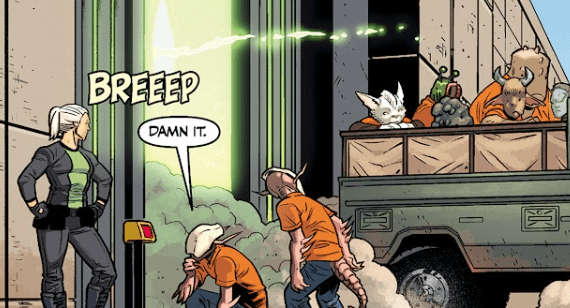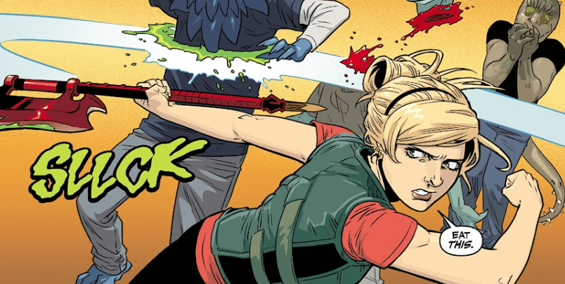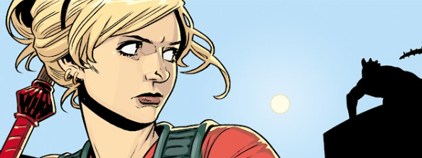Buffy approaches quietly between two trailers. Out of the corner of her eye, she spots movement on a roof. A heartbeat later, she hears the familiar sound of spines being fired from a lizard demon’s tail.