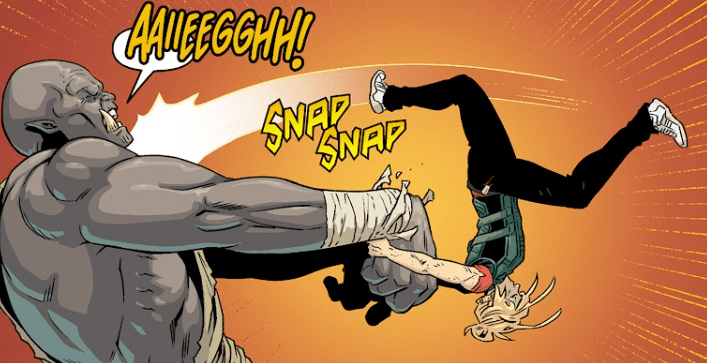 She kicks him away with a thud. “Know what I call that? Eighteenth birthday present. From my teacher.” Her eye is bruising, blood pours from her nose, and she may have lost a tooth — but she doesn’t slow.