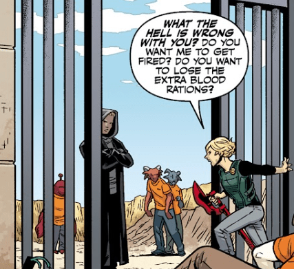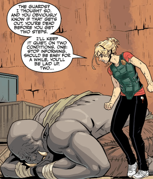 “The guards? Thought so. And you know if that gets out, you’re dead before you take two steps.” She stands over him. “I’ll keep it quiet, on two conditions. One: stop informing. Should be easy for a while… you’ll be laid up.” She can’t resist the sarcasm.