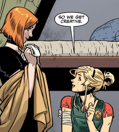 Willow gasps. “Calliope, we can’t.” Calliope asks if she’s too injured, but Willow shakes her head — it’s her girlfriend outside she’s thinking of.