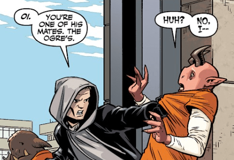 Spike grabs a demon worker in the line — completely at random — shouting that he’s mates with the Ogre. He slams the demon into a wall, then hurls him through the gate.