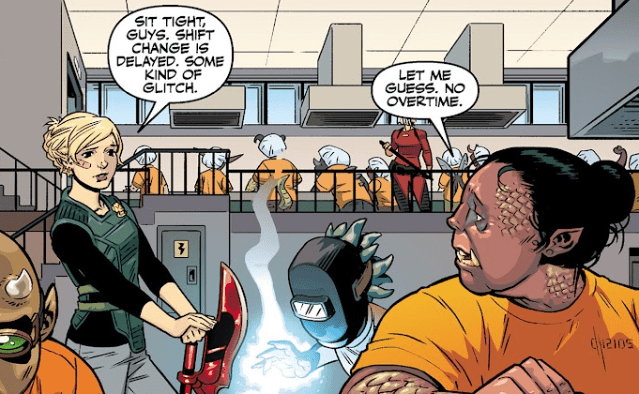 “Tell everyone to stay put. Shift change is delayed until we can fix your boyfriend’s mess.” She turns to Spike. “Keep away from the gate, or I’ll take further action.”