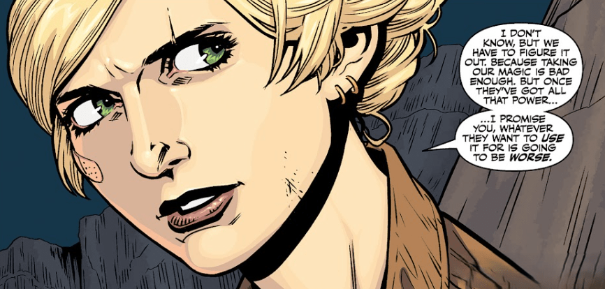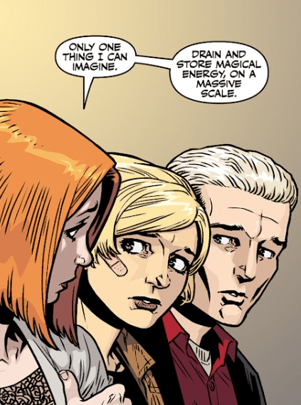 Buffy looks at him. “I don’t know. But we have to figure it out. Because taking out magic is bad enough — but once they’ve got all that power…” She pauses, thinking it through. “I promise you, whatever they want to use that power for is going to be worse.”