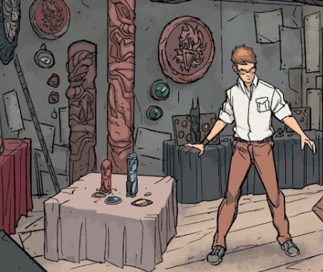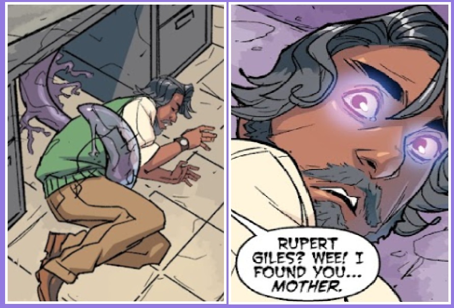 As Giles bounds through the door, he’s ordered to close it quickly. The room itself is filled with ancient artefacts and tribal masks. Totem poles, tribal images. It looks more like a museum than an office.