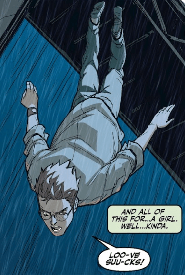 “Love Sucks!” he yells jubilantly as he falls. He takes a deep breath and then hits the water. He looks around for what he needs.