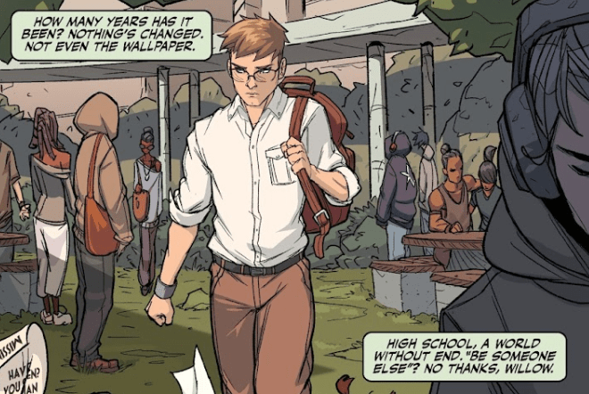 How many years has it been? Nothing’s changed. Not even the wallpaper. High school. A world without end. “Be someone else”? No thanks, Willow.