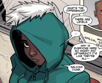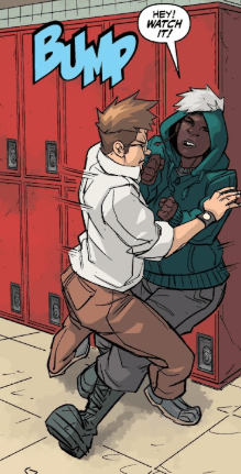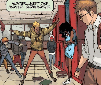 The students rush away, the bully dropping him to the floor, his books scattered like trash around him. A girl in a blue hoodie comes from around a corner and whispers at him to run. He doesn’t have much of a choice.