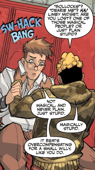 It works. He’s slammed against the locker by the bully, who proceeds to impersonate and mock Giles’s accent. “Are you lost? One of those magical people? Or just stupid?”