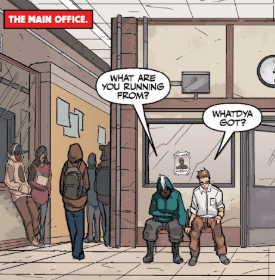 A security guard named Sheffield rounds the corner and spies them. In a deep, monotone voice, he stares at the two. “Runners.”