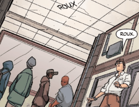 He sees a familiar blue hoodie coming through the smoke. He sees Roux’s face and then recoils.