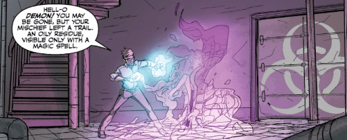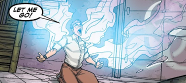 Then Giles tells her to stop, calling out to her. He uses a telekinetic blast of energy and propels her away from the bully and into the nearest wall. He reforms his magical glow into restraints, keeping Roux pinned.