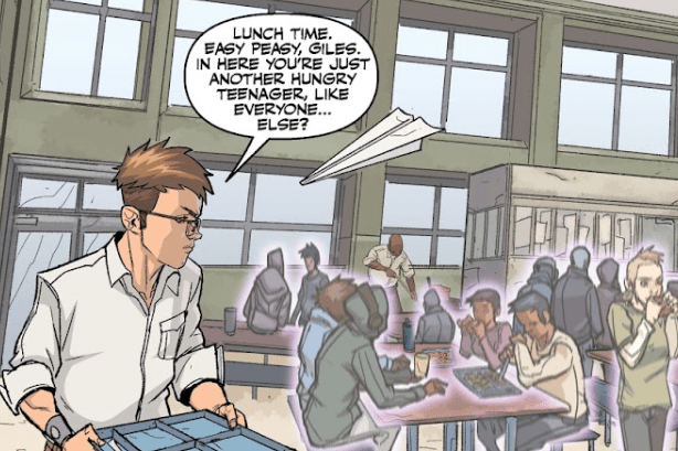 By the time Giles picks up his tray and walks into the cafeteria, he knows something else is wrong. Although he can walk freely across the room, the rest of the student body and the staff are all frozen in place. Frozen in time. Giles observes the room, stunned.