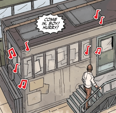 He looks around and then races to the office where the tannoy system is coming from. As he approaches the door, he hears music. The voice orders him again.