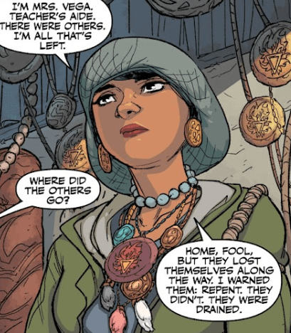 She doesn’t extend her hand as she introduces herself. “I’m Mrs. Vega. Teacher’s aide. There were others. I’m all that’s left.”