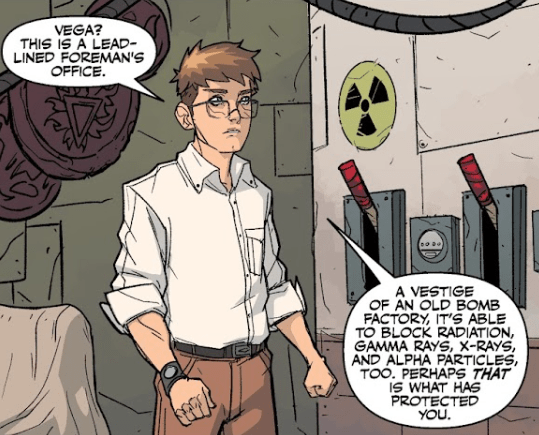 Giles looks around the room. Behind all the artefacts and decoration, he can see more radiation warnings. “Vega, this is a lead-lined foreman’s office.” He looks surprised and slightly perplexed.