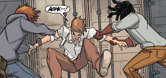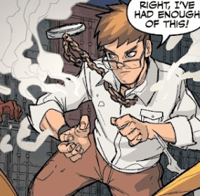 As soon as he’s out of their view, Giles conjures up a ball of smoke, filling the small space with it, cutting off the vision of the bullies. Unfortunately for Giles, the ringleader catches up to him in the haze – and pulls out a blade.