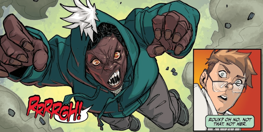 Using her vampire reflexes, Roux cuts through the students with ease. She reaches down, growling, at the leader’s throat, snarling.