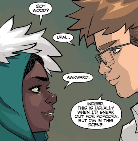 “Activist? I like that. So, how about it? We’re stronger together. My brains.” She looks him up and down. “Your wood?”
