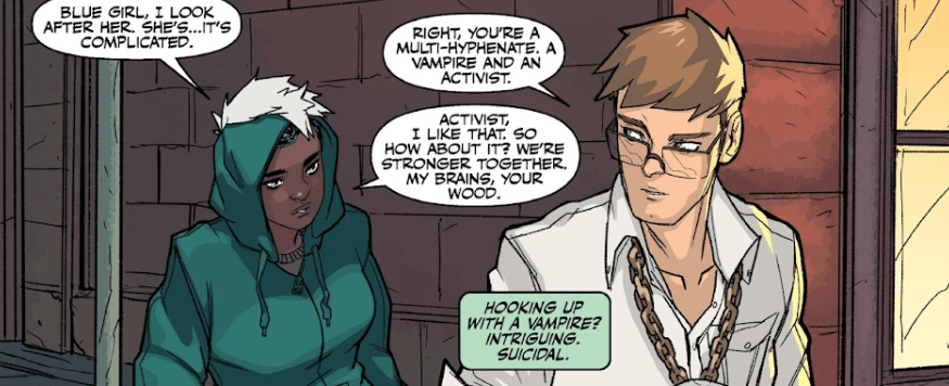 As Giles walks away, Roux zips up her hoodie and follows him. “So you want to work together? You’re a vampire killer looking for a demon.”