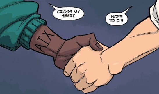 She extends her hand. “Cross my heart.” Her wrist has AIX tattooed on it, in black, capital letters.