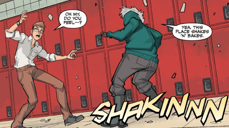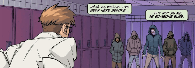 Giles sees the five bullies, hoods up, skulking at the end of the corridor, lockers hemming him in on both sides. Willow’s words about a fresh start echo in his mind. He’s still not convinced.*