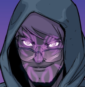 He looks straight into the leader’s eyes — and freezes. Beneath the hood, a face half‑lost in shadow, a purple glow pulsing under the skin, running like rivers through the veins and pooling behind the glasses.