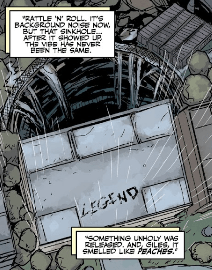 “Rattle and roll,” Addy says. “Background noise now. But that sinkhole… after it showed up… the vibe changed. Something unholy was released.” He hesitates. Fear flickers in his eyes. “And Giles… it smelled like peaches.”