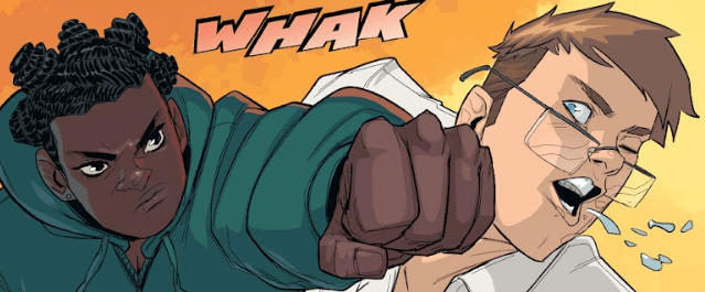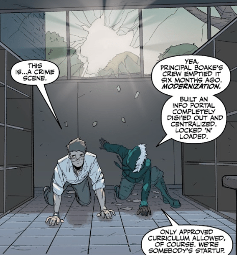 Everyone is affected, he says. Teachers disappearing. Kids acting like zombies — or worse. “They’re aggressive. Angry. Frustrated. While the government chases magical people, Principal Boake’s a scandal, all hemmed up with corporate underwriters. How else can they communicate except to ban something? This place is one big SOS. Something’s rotten here in Compton.”