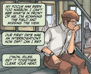 My focus has been too narrow. I can’t see what’s in front of me. I’m scanning the field and missing the view. Our first date was an interrogation? How daft can I be? C’mon, Giles. Get it together. Clear your head.
