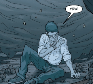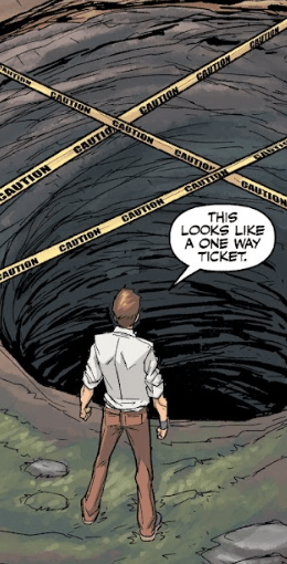 On the outskirts of campus, a sinkhole cordoned off with police tape catches Giles’s attention. He’s aware that he may not come back up, but he doesn’t hesitate, lowering himself into the hole and hoping for the best. Unfortunately, he slips and falls straight down, inexplicably plunging through floorboards at the bottom.