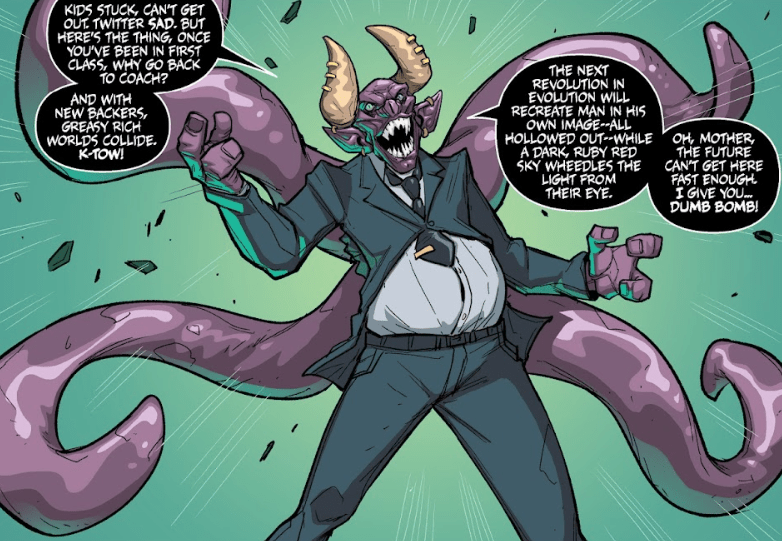The next revolution in evolution will recreate man in his own image – all hollowed out, while a dark, ruby-red sky needles the light from their eyes. Tentacles slide from his slimy skin as he cackles. Oh, Mother… the future can’t get here fast enough. I give you—the Dumb Bomb!