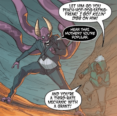 A tentacle snaps around his neck and chest, dragging him close. Seed’s teeth gnash, eyes flaring. Giles realises he’s pushed his luck too far and braces for death when a loud growl fills the cavern.