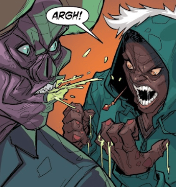 He flings Giles to the ground and turns to face the vampire. Roux pounces, racing behind him and sinking her fangs into his shoulder – but whatever she draws isn’t blood. She spits it out, hissing as if it burns.