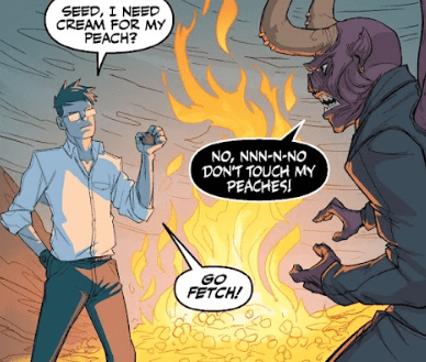 Seed snarls, more offended by the insult to his fruit than anything else, and charges. At the last second, Giles hurls the peach into the wall of fire spreading through the cavern.