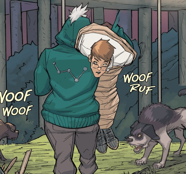 Giles stares, stunned, mouth opening to ask a dozen questions — but a bark echoes from the darkness. He looks up to see a vicious dog, foam dripping from its jaws, glaring at them.