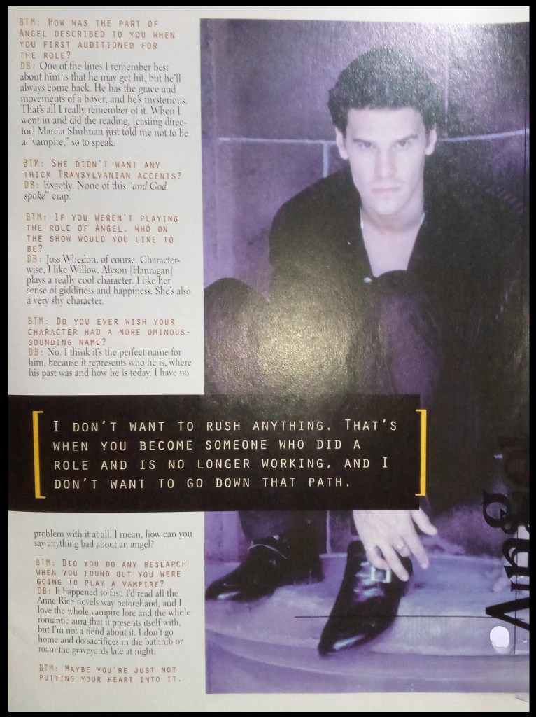 An interview with David Boreanaz, conducted during the hiatus between Buffy Seasons 2 and 3, after the confirmation of his upcoming spin-off, a year before cameras rolled on the launch of Angel.