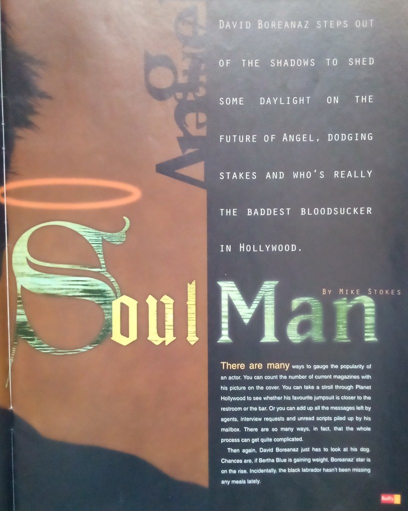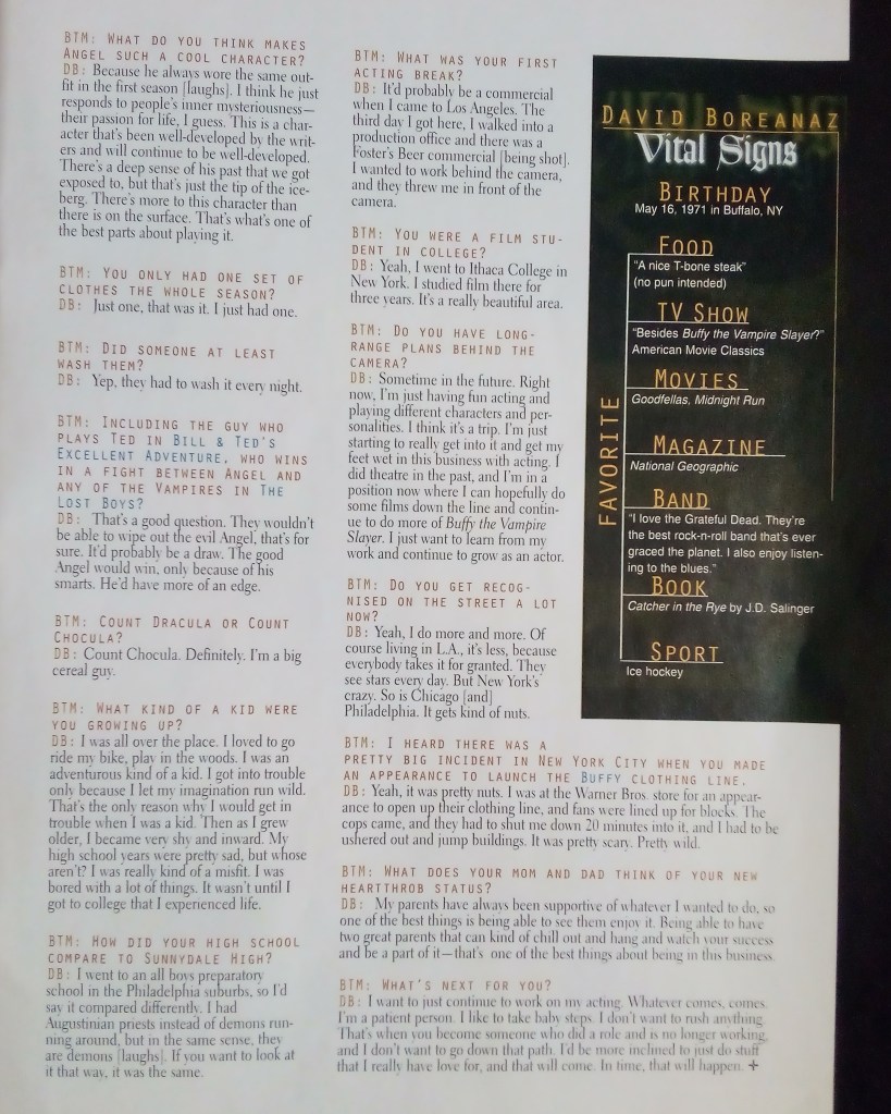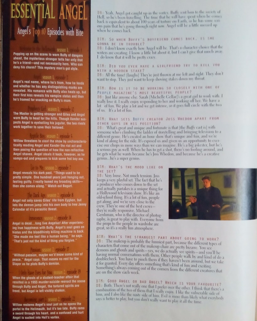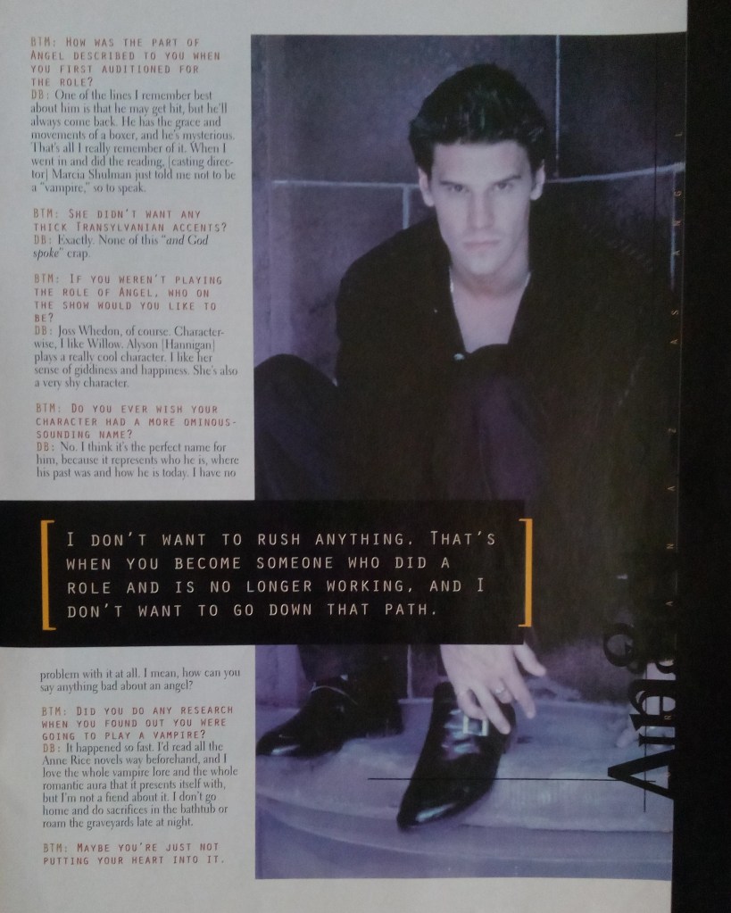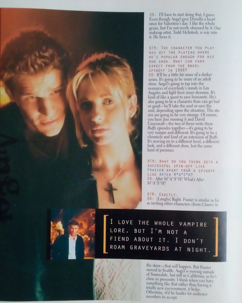 An interview with David Boreanaz, conducted during the hiatus between Buffy Seasons 2 and 3, after the confirmation of his upcoming spin-off, a year before cameras rolled on the launch of Angel.