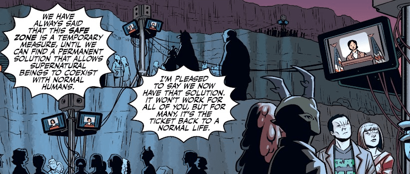 “I know this has been a trying time for you. We have always said that this Safe Zone is a temporary measure until we can find a permanent solution that allows supernatural beings to coexist with normal humans. I’m pleased to say we now have that solution. It won’t work for all of you, but for many, it’s the ticket back to a normal life.”