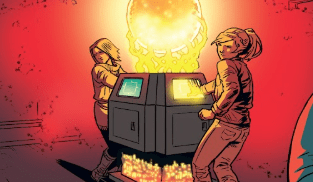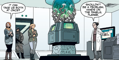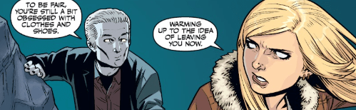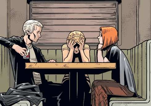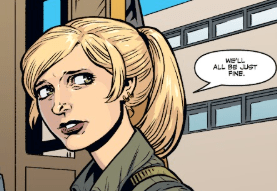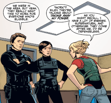 Inside the Safe Zone’s Administration building, Buffy considers raising her voice at the agents standing in front of her, but out of respect for their history, she decides Riley Finn and his wife Sam are not the real targets of her annoyance. “They brought you here just to twist my arm?”