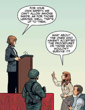 One reporter asks to speak to a resident from inside the Zone, but she’s told no — for their own safety. The journalist remains undeterred, continuing with another question: what about the residents who haven’t accepted the procedure? Or those who wouldn’t survive it?