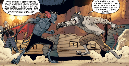 That evening, another fight breaks out between residents — this time a wolf and a vampire shaped like a bat. The vampire admonishes the werewolf for agreeing to the procedure. The wolf just wants to be normal again and go home, but the vampire doesn’t agree. He’s betraying his nature and his kind.