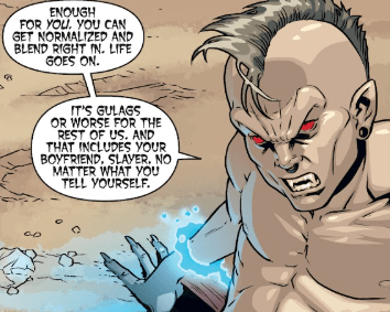 From the floor, shifting into his human form, the vampire snarls at her in disgust. “You can get normalised and blend right in. Life goes on. It’s gulag or worse for the rest of us. And that includes your boyfriend, Slayer. No matter what you tell yourself. Not that it’ll make any difference. When it all goes to Hell, you’re gonna side with your own kind every time. Even when they’re kicking you in the teeth and destroying the ones you say you love.”