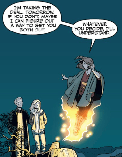 She looks out over the valley before them. “I’m taking the deal,” she announces. “If you don’t, maybe I can figure out a way to get you both out. Whatever you decide, I’ll understand.”