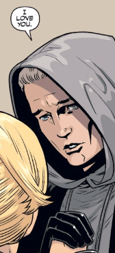 He looks down at her, squinting in the sunlight. “I love you,” he tells her tenderly. She goes to answer him, but he shushes her with a gloved finger to her lips. “Tell me when we see each other again,” he whispers.