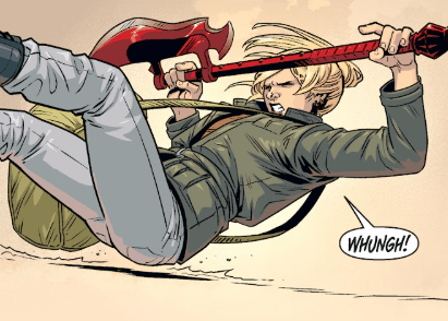 A voice from behind her gets her attention. It’s Jordan the Slayer. She has the Scythe in her hands. She throws it at Buffy. “Don’t forget this.”