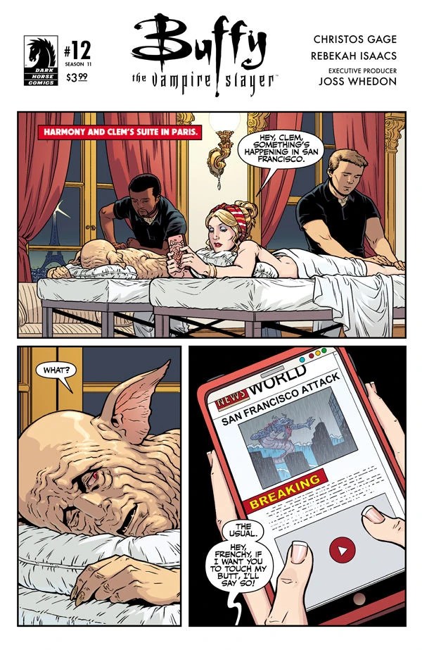 Across the rooftop, Spike explains that most vampires have crawled back into the shadows. Except Harmony, who’s all over social media — she’s been out of the country the whole time.
