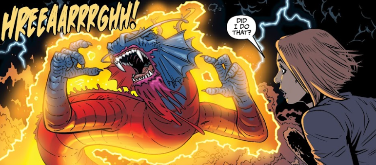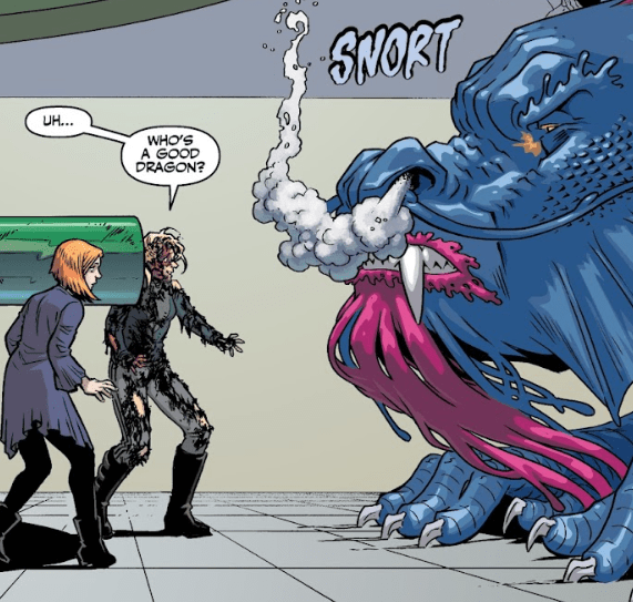 Buffy, still smoking, limps toward the dragon, hand extended. “Who’s a good dragon?” she asks.